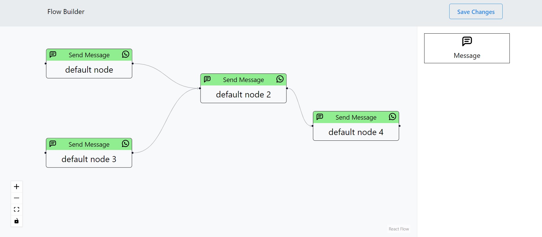 ResumeA chatbot flow is built by connecting multiple messages together to decide the order of execution. The flow builder currently supports only one type of message (Text Message). Nodes are added to the flow by dragging and dropping a Node from the Nodes Panel. Settings Panel replaces the Nodes Panel when a Node is selected. It has a text field to edit text of the selected Text Node.